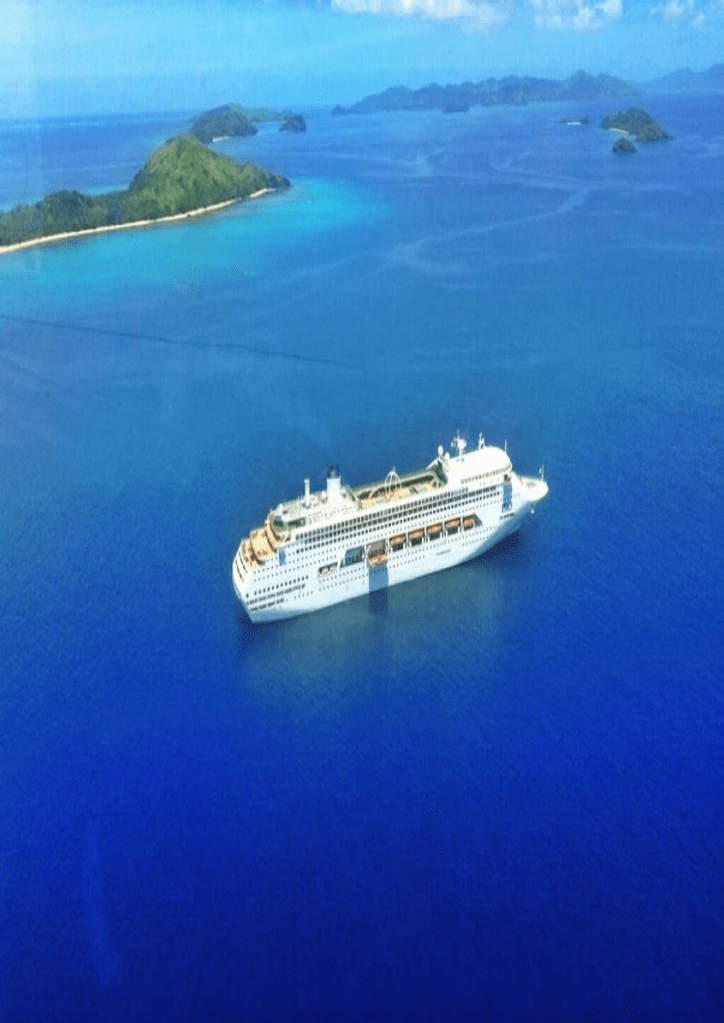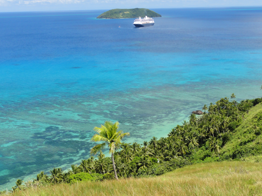 The picture below shows the extent of the ‘original large composite volcanic centre’ and the fragments that have subsequently formed islands. These are: to the south east bottom of the picture (not shown) lies Vanuakula. The cruise ship is anchored between Vanuakula and Dravuni (second image). Next to Dravuni are Yaukuve Levu and Yaukuve Sewa or Yaukuve Lailai. Buliya (separate volcanic centre) lies behind. Across the lagoon are Qasibale, Namara, Yanuyanu i loma and Yanuyanu i sau. Buliya’s offshore islands, Ono Island and Kadavu mainland in the background are on the outer fringe of this large composite volcanic centre.
